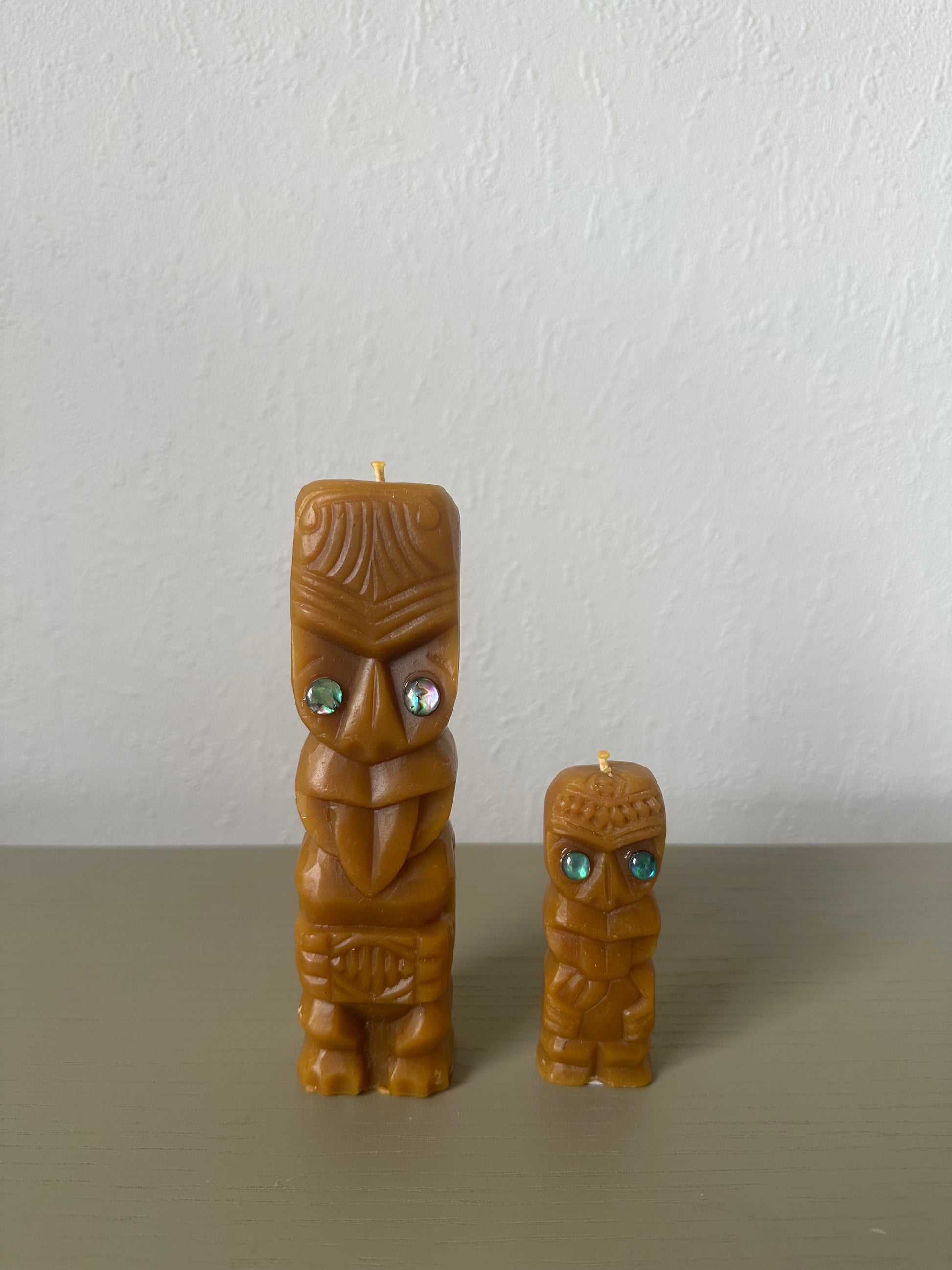 Our Te Pou candles are a tribute to the original NZ souvenir candles that were once made here in Aotearoa between the 1970s - 80s. Instead our candles are made in 100% pure manuka beeswax with pure cotton wicks with no added waxes, colourings and synthetic fragrances, they still have Paua shell eyes.
